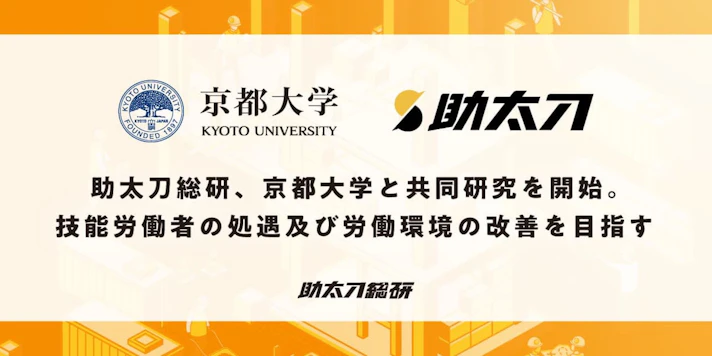 建設業界に従事する全ての人たちを支えるマッチングプラットフォーム「助太刀」を運営する株式会社助太刀(以下 「助太刀」)は、京都大学大学院工学研究科 金多・西野研究室(建築学専攻・建築生産工学講座/建築社会システム工学分野、研究代表者 金多隆 教授)と「データを用いた技能労働者の実態把握」に関する共同研究契約を開始することをお知らせします。