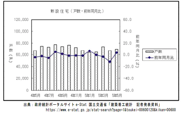 - 5 月の新設住宅着工は持家は減少したが、貸家及び分譲住宅が増加したため、全体で前年同月比 3.5% の増加となった。