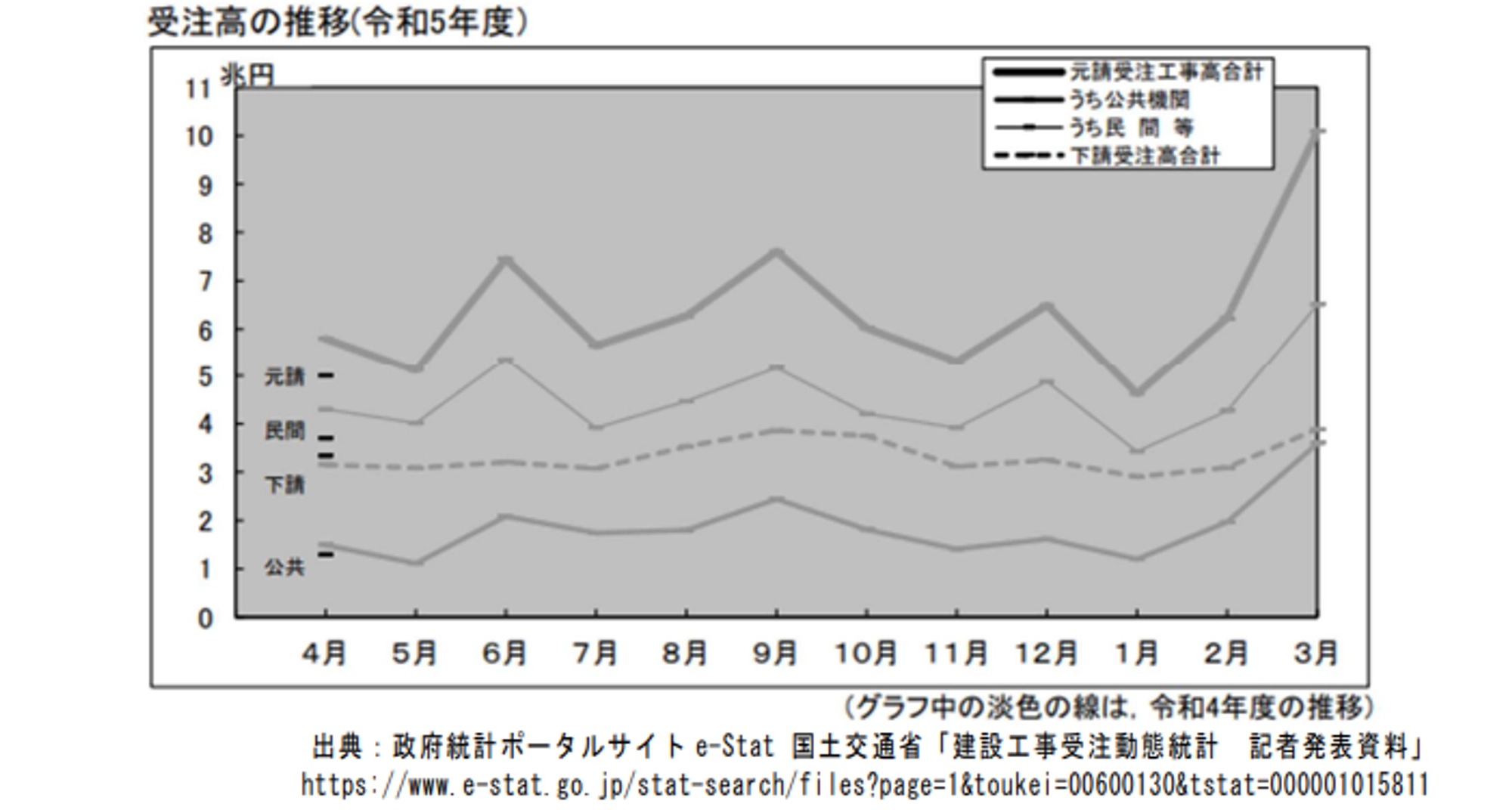 - うち元請受注高は 5 兆 15 億円で、同 13.7% 減少し、下請受注高は 3 兆 3,344 億円で、同 5.8%増加した。
