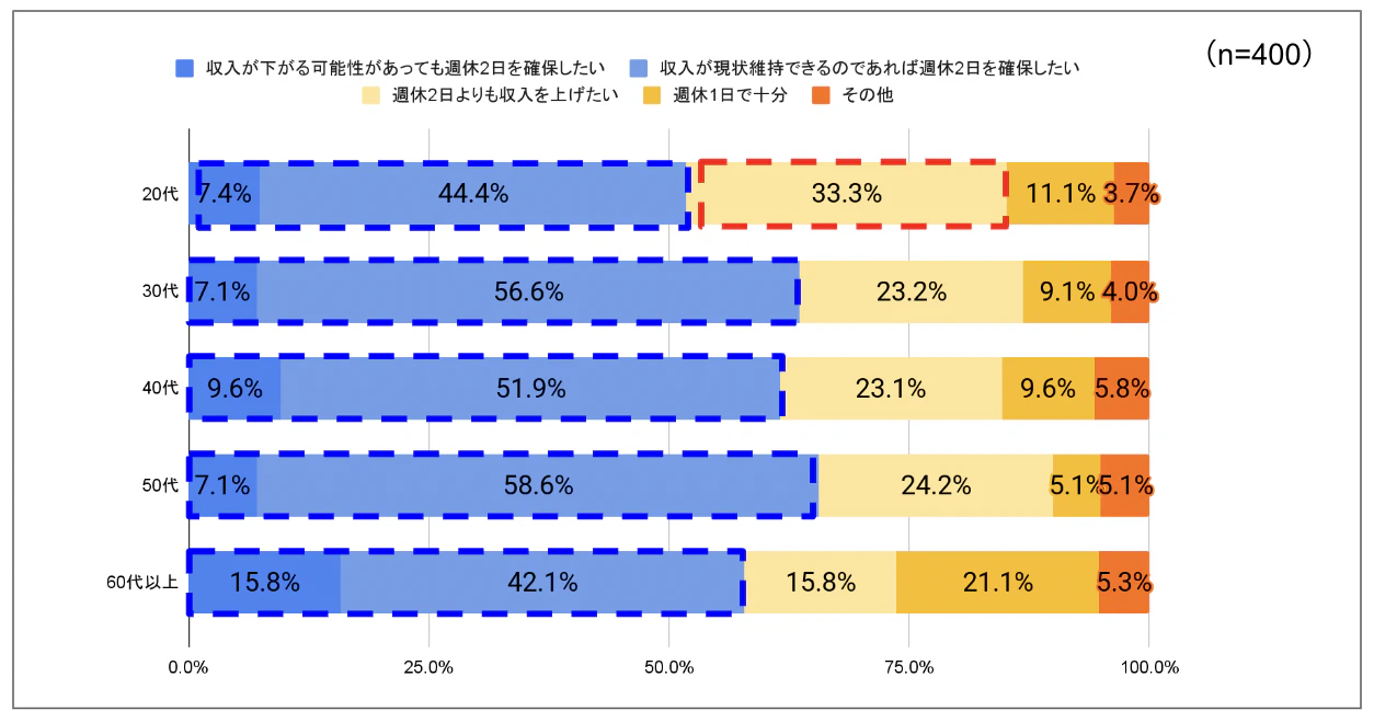 特に30代以上の回答者において、「週休2日を確保したい」という意識が高まっており、