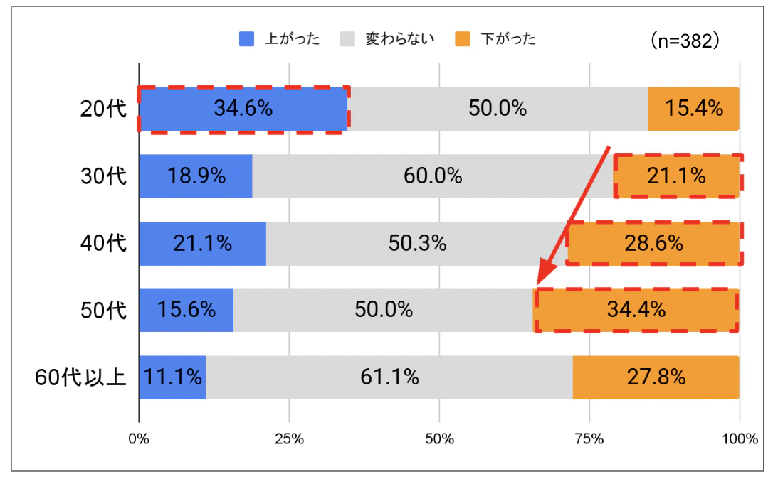 また、年齢別で確認した結果、20代では34.6%が「上がった」と回答したものの、