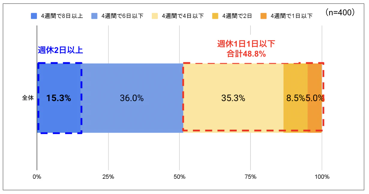 以上休日を確保できている回答者は15.3%に留まりました。