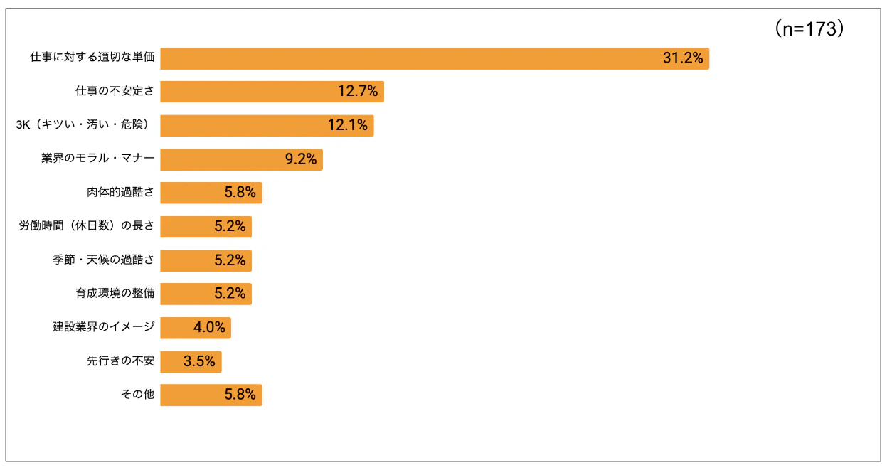 建設業界の課題として、「仕事に対する適切な単価」に対する意見が最多となりました。