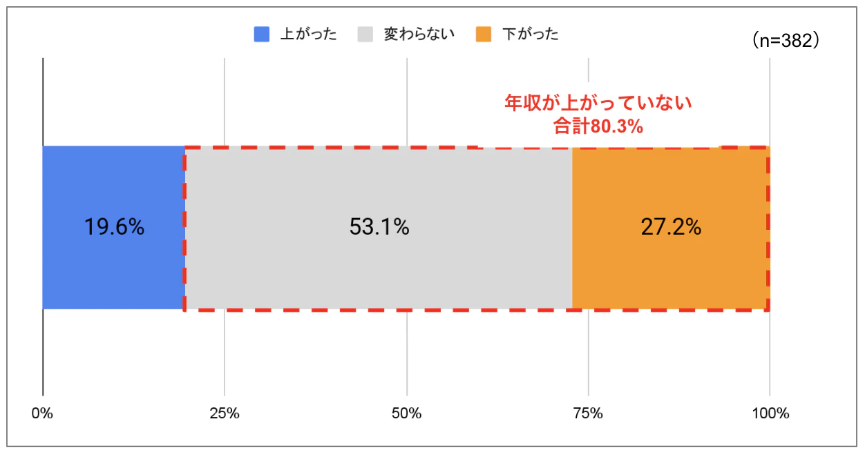 過去1年の年収が上がったかどうか確認した結果、全体の80.3%が「過去1年で年収が上がっていない」と回答がありました。