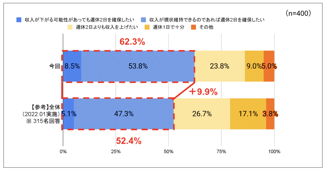 調査を実施したところ、週休2日希望回答者は52.4%の結果であり、2022年1月の前回調査より