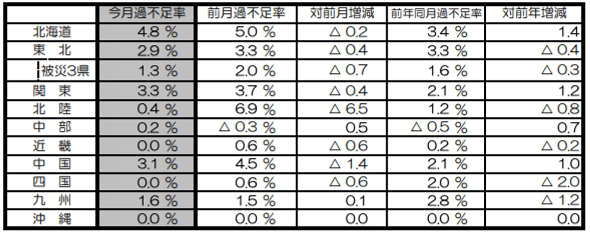 - 地域別に過不足率を前年同月と比較すると、北海道と中国が1.1ポイントの増で、全国で最も増加幅が大きくなっているが、北陸が1.2ポイントの減で、全国で最も減少幅が大きくなっている。