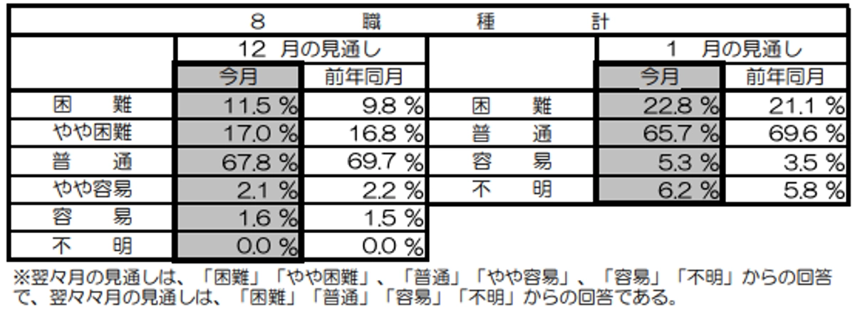 - 翌々々月(1月)に関する見通しについては、「困難」が22.8%で対前年同月(21.1%)比1.7ポイ ントの上昇となっている。「容易」は5.3%で、対前年同月(3.5%)比1.8ポイントの上昇となってい る。