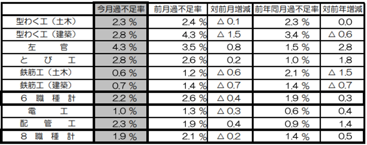 - また、左官の過不足率について、対前年の増加幅が大きくなっている(1.5%→4.3%)が、鉄筋工 (土木)の過不足率については、対前年の減少幅が大きくなっている(2.1%→0.6%)。