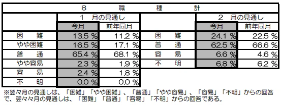 - 8職種の今後の労働者の確保に関する見通し(1月及び2月)については、全国及び東北地域とも「普通」となっている。