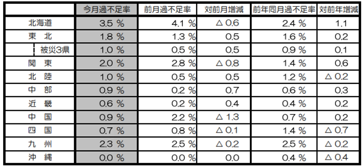 - 地域別に過不足率を前年同月と比較すると、北海道が1.1ポイントの増で、全国で最も増加幅が大きくなっているが、四国が0.7ポイントの減で、全国で最も減少幅が大きくなっている。