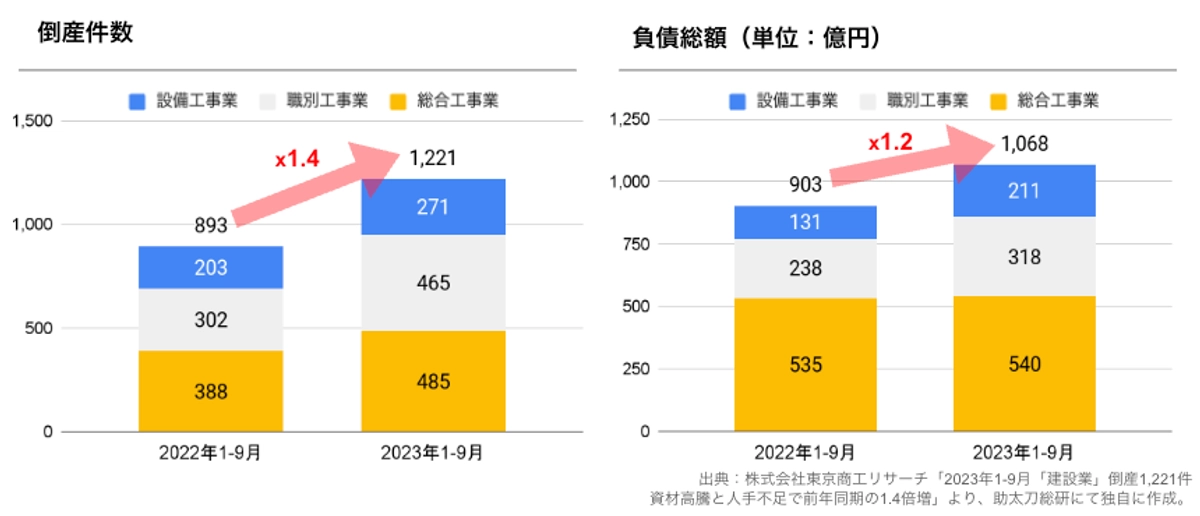 東京商工リサーチの調査では、2023年1-9月の建設業の倒産は1,221件と、前年同期の約1.4倍に達するなど、建設業の倒産が増勢をたどっています。