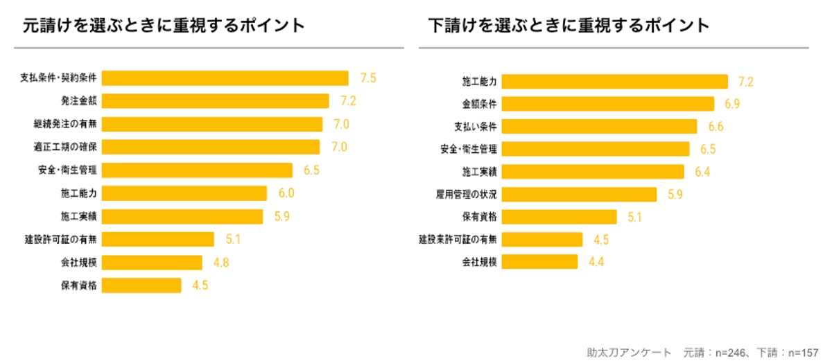 元請けは「支払い条件・契約条件」の平均点が最も高く、「発注金額」、「継続発注の有無」と続き、下請けは「施工能力」の平均点が最も高く、「金額条件」、「支払い条件」と続くことが分かりました。