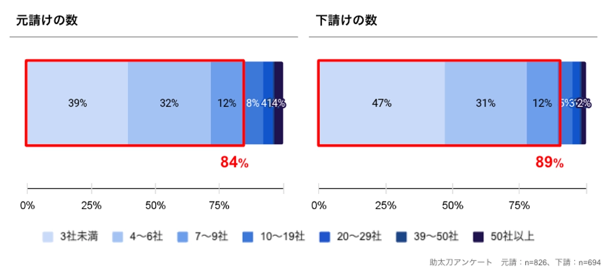 図1は元請け、下請け双方での取引先数の企業割合について示したグラフです。元請けの数は84%が10社未満であり、下請けの数は89%が10社未満という結果となりました。また、下請けの数は3社未満の回答が約半数であることが分かりました。