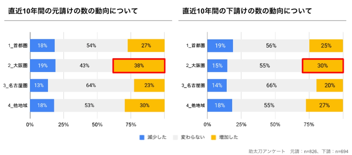 地域別では、元請けの数は、大阪圏で「増加した」の回答が38%と、他地域と比較して高い結果となりました。下請けの数についても大阪圏で「増加した」の回答が30%と、他地域と比較して高い結果となりました。(図5参照)大阪圏については、再開発事業が進行中であるほか、万博、IRなど大規模プロジェクトを控え、先行きの建設需要は旺盛であることから人材の流動性が向上している可能性が考えられます。