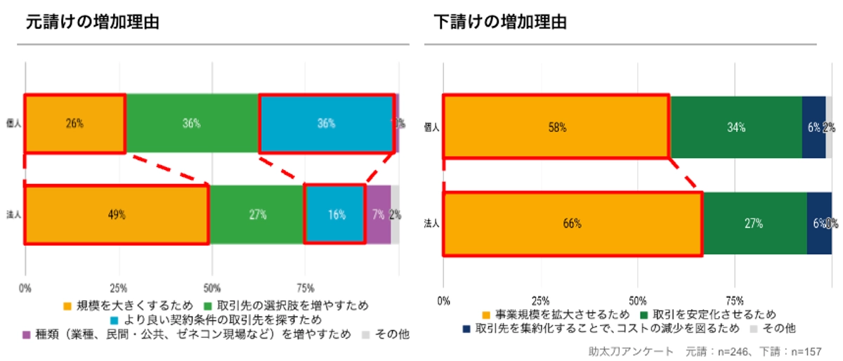 雇用形態別では、元請けの増加理由は、個人事業主は「よりよい契約条件の取引先を探すため」と回答した比率が法人比べて20pt高い一方、「規模を大きくするため」と回答した比率は23pt低いことが分かりました。