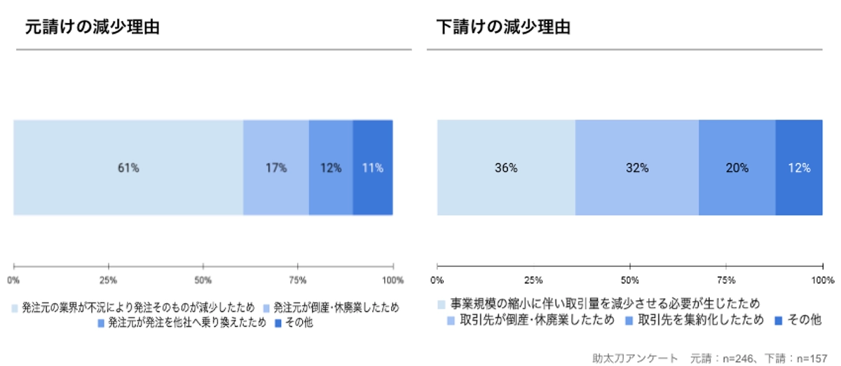 下請けの減少理由は「事業規模の縮小」が36%と最も多く、次いで「倒産・休廃業」が32%、「取引先の集約」が20%と続きました。