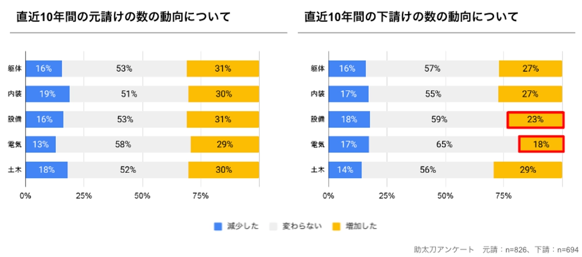 また、職種別では元請けの数は職種による差異はあまりみられなかったものの、下請けの数は「増加した」と回答した割合が設備で23%、電気で18%と他職種と比較して低いことが分かりました。(図6参照)