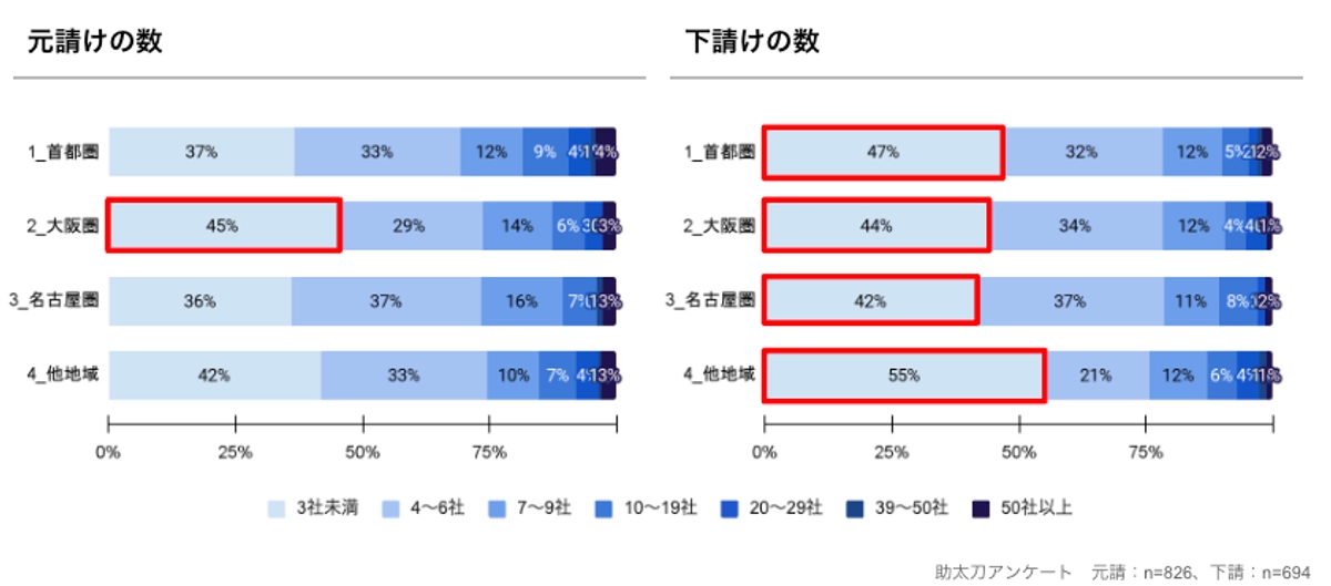 地域別では、元請けの数は大阪圏では首都圏と比較して3社未満という回答が8pt高いことが分かりました。また、下請けの数は3大都市圏で取引先数の構成比は大きく変わらない一方で、他地域は3社未満との取引の事業者が55%と高い傾向があることが分かりました。(図2参照)