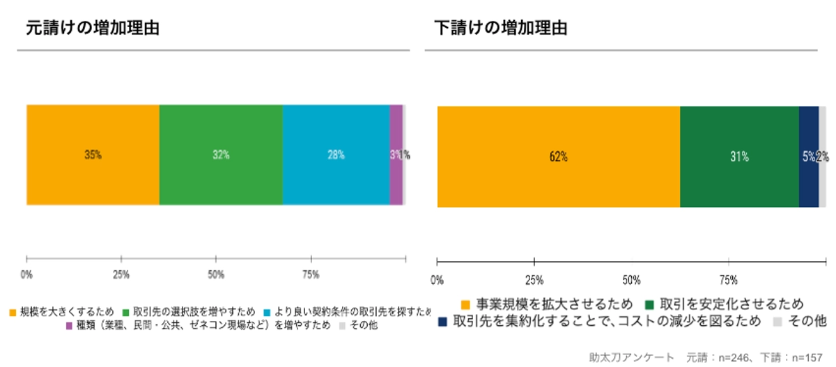 更に、図9で取引先増加の理由について調査したところ、元請けの増加理由は「規模拡大」が35%と最も多く、次いで「取引先の選択肢の拡大」が32%、「より良い契約条件の取引先を探す」が28%と続きました。