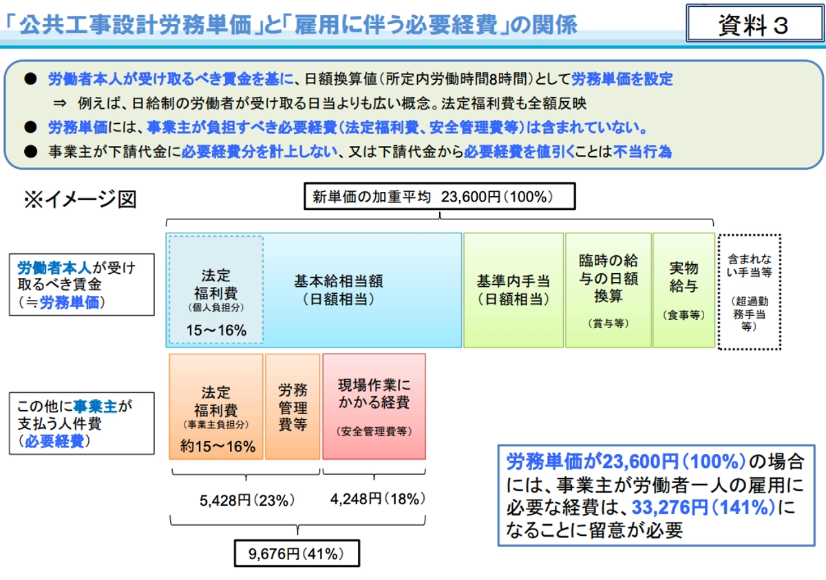3.労務単価には、事業主が負担すべき人件費(必要経費分)は含まれていないため、下請代金に必要経費分を計上しない、又は下請代金から値引くことは不当行為となる。
