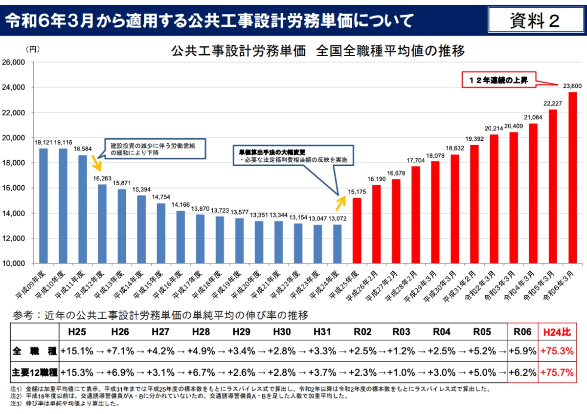 【2024年3月以降適用、公共工事設計労務単価】