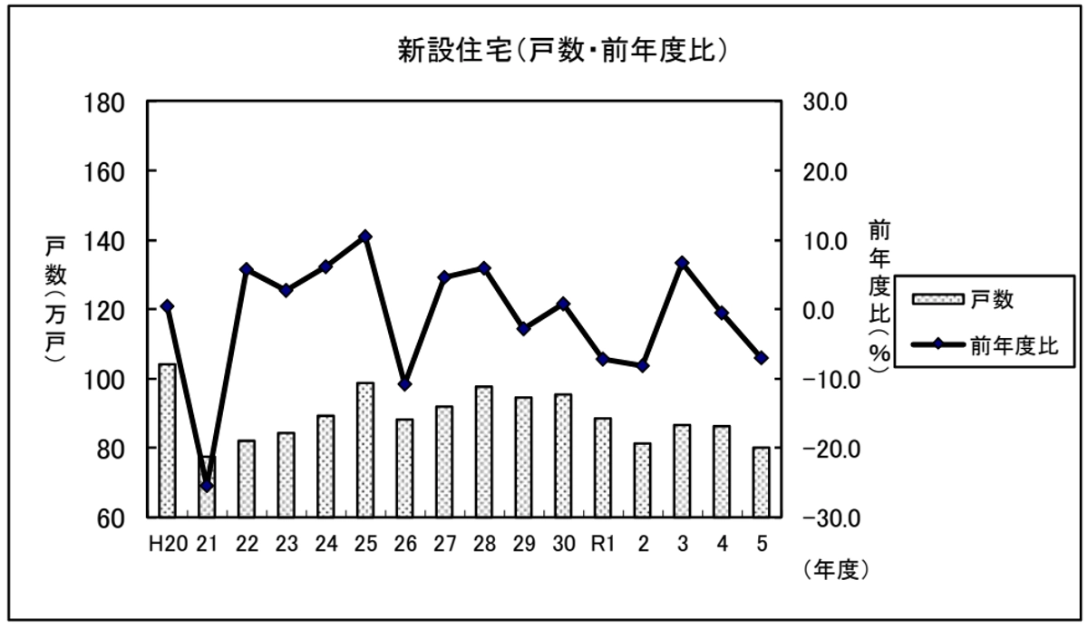 - 新設住宅着工戸数は800,176戸。(前年度比 7.0%減、2年連続の減少。)