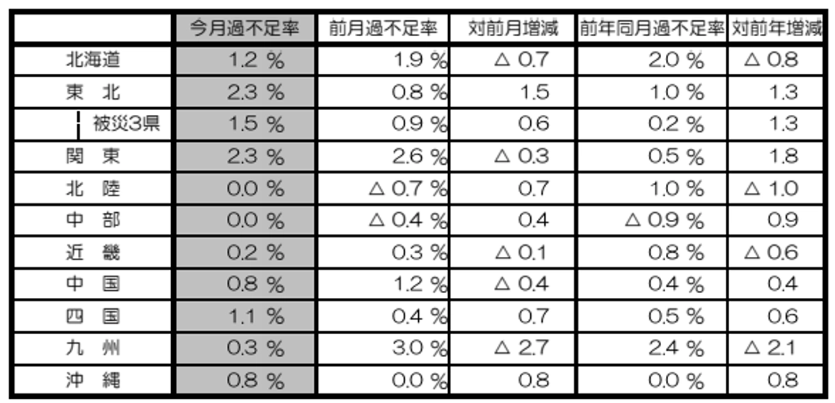 - 地域別に過不足率を前年同月と比較すると、関東が1.8ポイントの増で、全国で最も増加幅が大きくなっているが、九州が2.1ポイントの減で、全国で最も減少幅が大きくなっている。