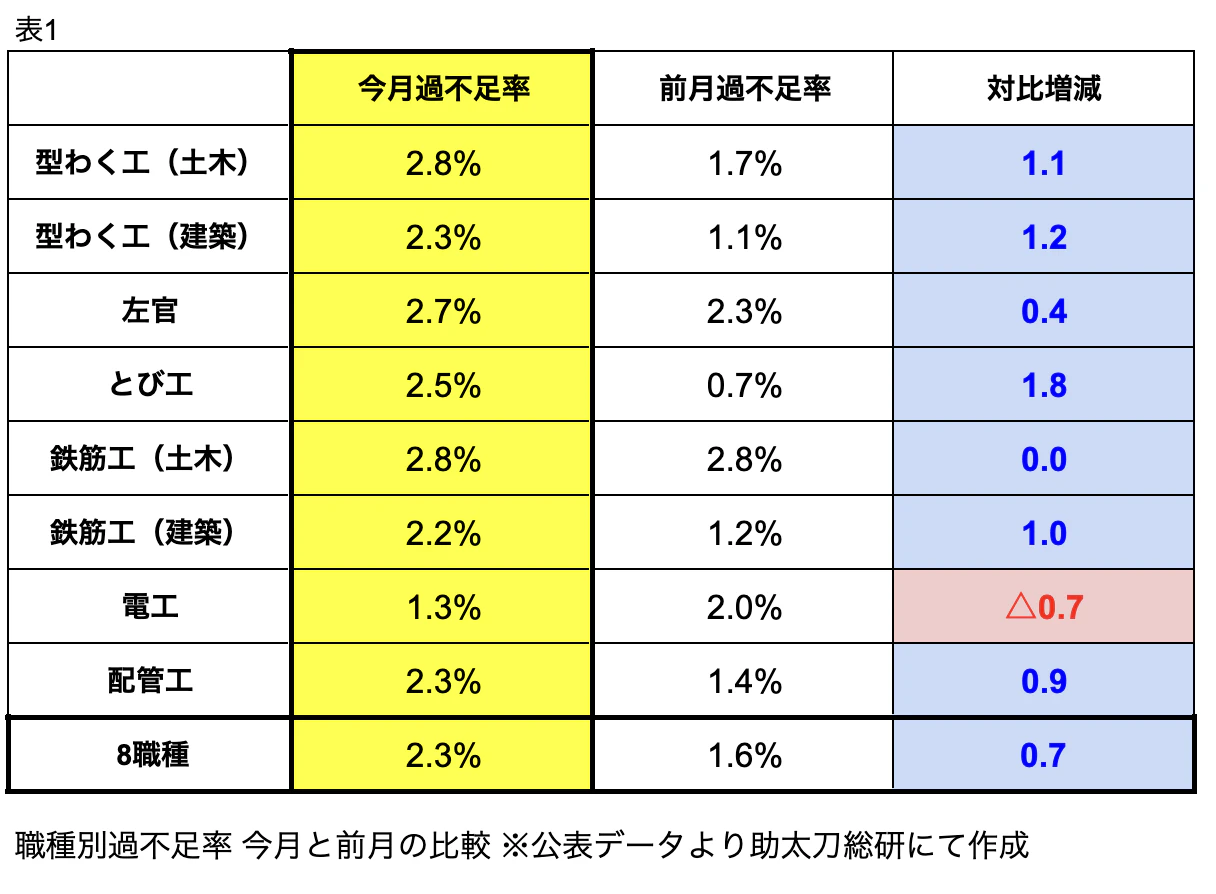 - 8職種の過不足率は2.3%の不足(前月比:+0.7%)
