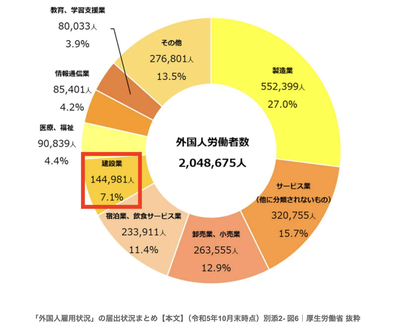 現在、日本で活躍している外国人労働者は、約200万人(2023年10月末時点)になっております。そのうち、建設業は約14万人で、全産業の7.1%となっています。