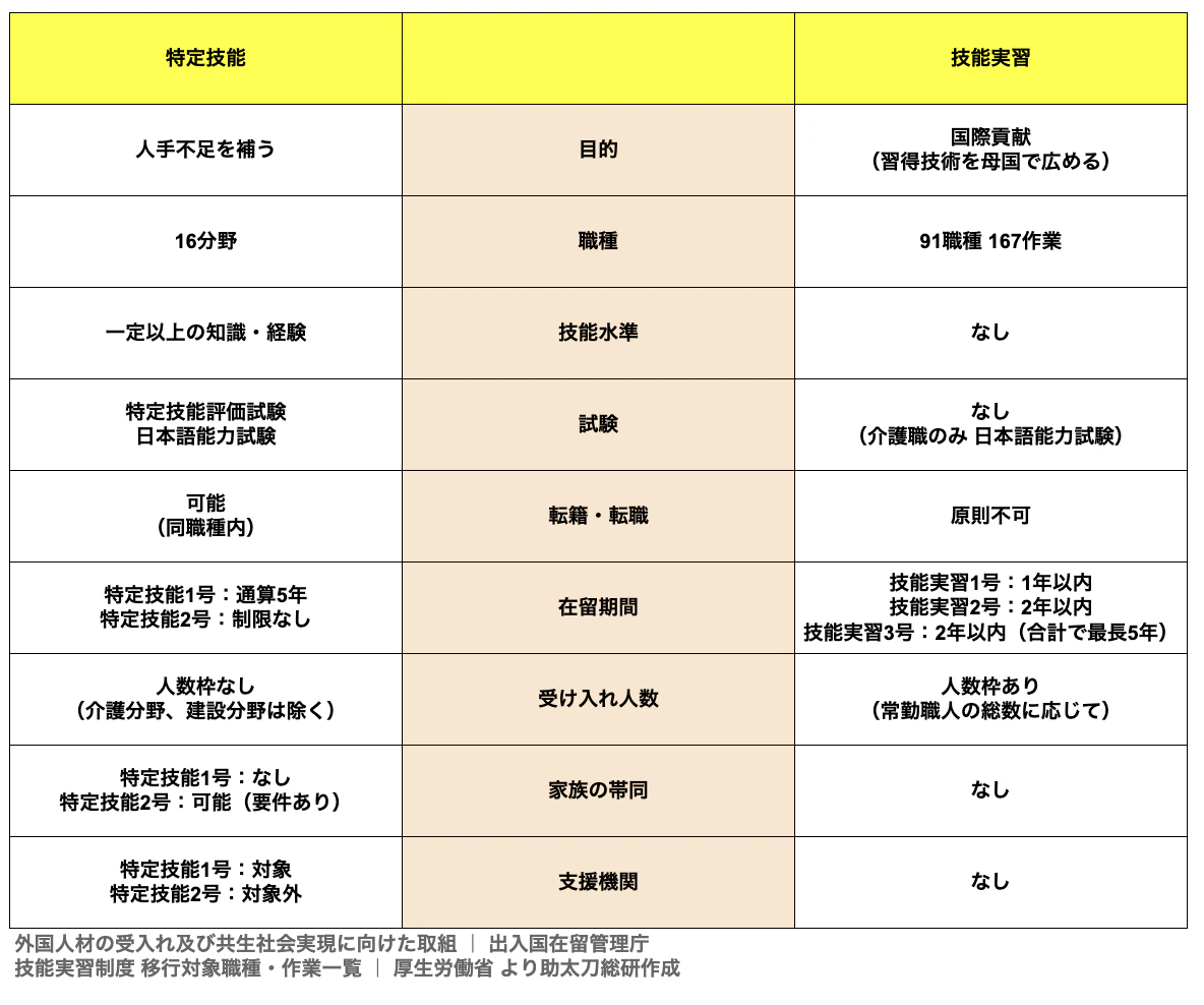 今回は「特定技能」と「技能実習」の違いを比較しながら、説明していきます。