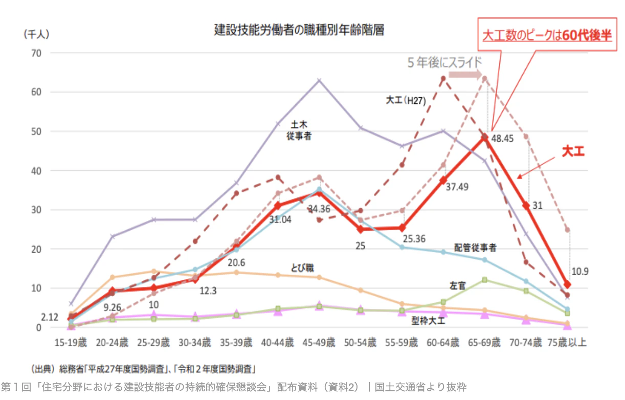 ・若年層の入職が不足しており、2050年には大工数が現在の約3分の1まで減少する可能性がある。