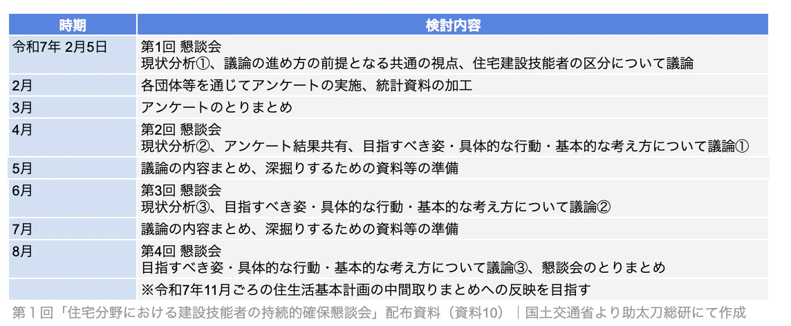 こうした現状を受け、国土交通省では住宅分野の建設技能者確保に向けた中長期的な方策を検討するため、有識者による「住宅分野における建設技能者の持続的確保懇談会」を設置し、2025年2月5日に第1回会合を開催しました。