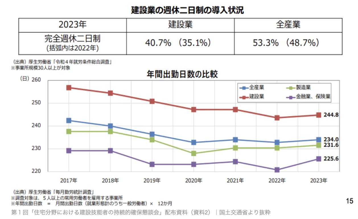 ・年間休日は全産業平均116. 4日に対し、建設現場は99. 4日と少ない。