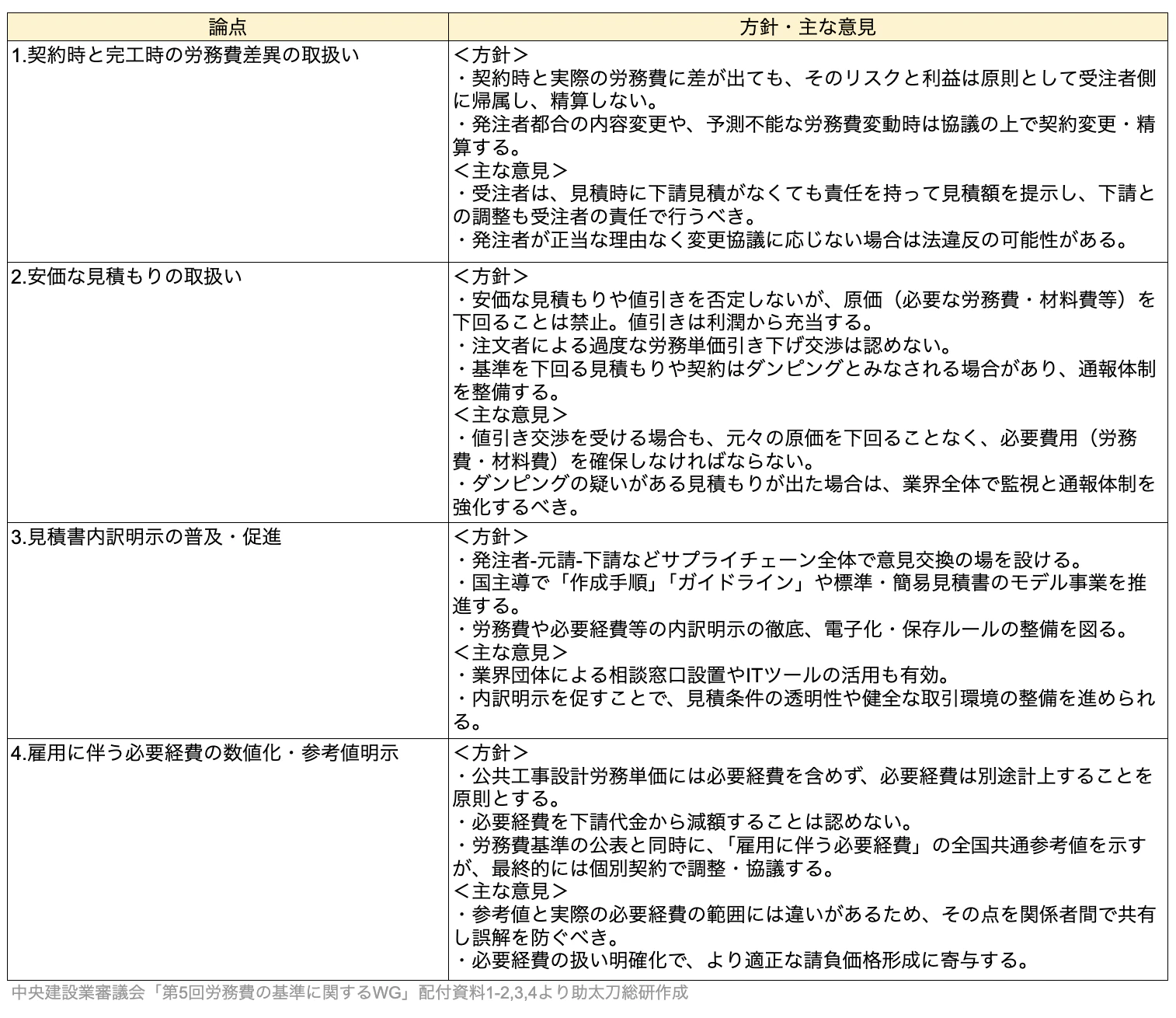 それぞれの論点とそれに対する方針と主な意見についてまとめました。