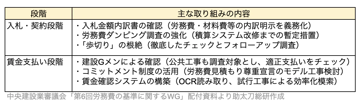 入札・契約段階と賃金支払い段階で実施される主な施策をまとめました。